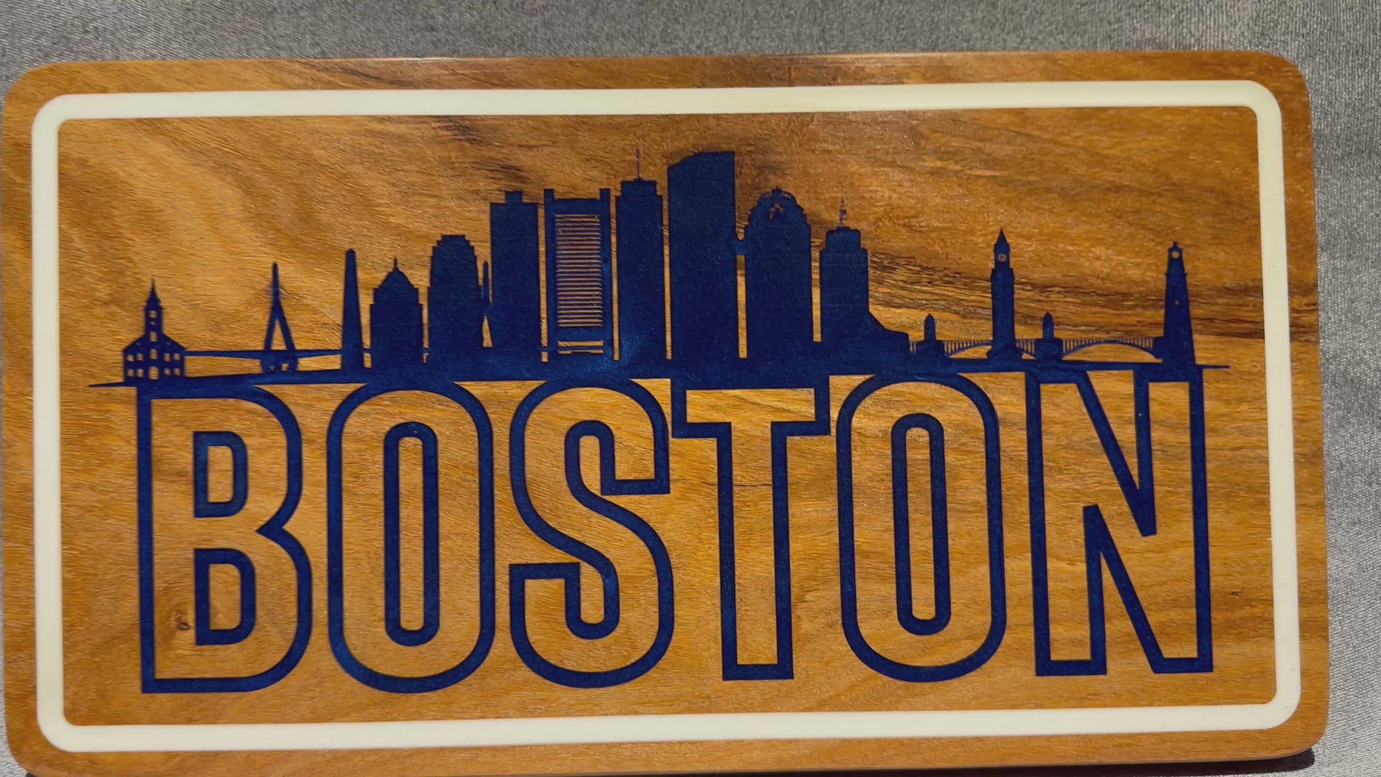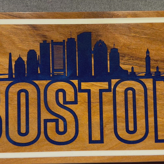 • Precision-carved Boston skyline + bold typography
